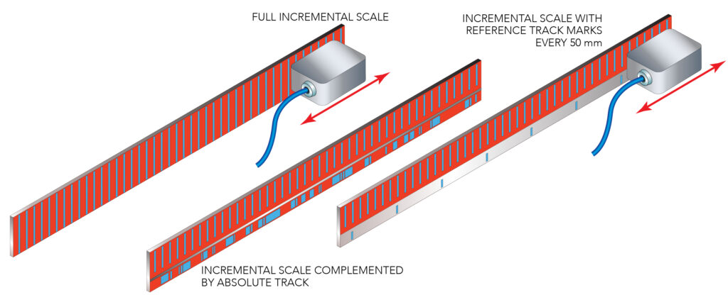 After traversing two reference marks, linear encoders with such scales can report absolute position as well as the distance between the two marks and the direction of travel as well as the length of each magnetic pole and the basic increment — the distance between odd reference marks.